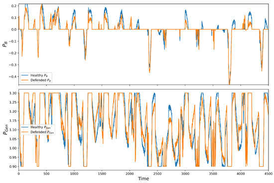 Figure 17 shows the defense strategy impact on the EMS outputs, and . The results represent the role of the proposed defense method in battery utilization enhancement. The output of the defended model fluctuates considerably less than the under FSA. The battery utilization has reduced by 23% and 60.5% compared to its values in healthy and FSA conditions, respectively. It clearly shows the effectiveness of the proposed defense algorithm as the goal of the EMS optimizer was to minimize the battery’s usage, the defense strategy.