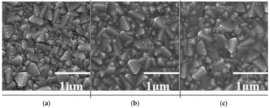 The ETLs are important components in the fabrication of PSCs, as they help to transport electrons generated by the PVSK absorber layer to the electrode. In this study, the TiO2, SnO2, and TiO2/SnO2 bilayer ETLs were deposited on FTO substrates. SEM images visually compare the surface morphology of TiO2, SnO2, and TiO2/SnO2 bilayer ETLs, as shown in Figure 1. The small particles present on the surface of TiO2 may be attributed to the aggregation of TiO2 nanoparticles during the chemical bath deposition process. Conversely, the smoother surface of SnO2 suggests that the spin-coating process resulted in a more uniform and homogeneous film during the formation of SnO2. The TiO2/SnO2 bilayer ETL structure combines both TiO2 and SnO2, and the SEM image shows a surface morphology that falls in between that of TiO2 and SnO2 ETL. A smoother ETL surface facilitates the transport of charge carriers at the interface of PVSK and ETL.