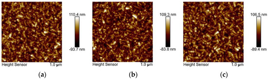 Figure 2. AFM images of (a) TiO2, (b) SnO2, and (c) TiO2/SnO2 bilayer ETLs deposited on FTO substrates.