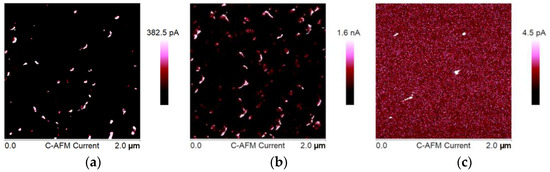 Figure 3. C-AFM images of (a) TiO2, (b) SnO2, and (c) TiO2/SnO2 bilayer ETLs on FTO substrates.