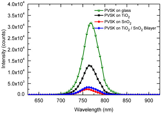 Figure 4. PL spectra of PVSK/glass, PVSK/TiO2, PVSK/SnO2, and PVSK/bilayer ETL interfaces.