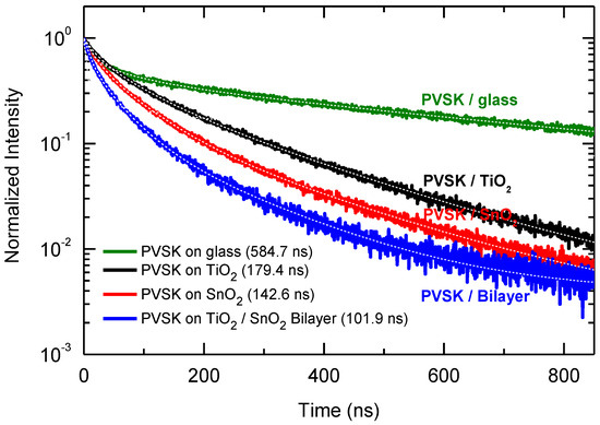 Figure 5 illustrates TR-PL fitting curves and the corresponding calculated lifetimes for different samples, which include PVSK/glass, PVSK/TiO2, PVSK/SnO2, and PVSK/bilayer. The respective lifetimes for these samples are as follows: 584.7 ns for PVSK/glass, 179.4 ns for PVSK/TiO2, 142.6 ns for PVSK/SnO2, and 101.9 ns for PVSK/bilayer. The TR-PL results demonstrate that the PVSK grown on glass exhibits the longest carrier lifetime. Interestingly, as different ETLs are added, the carrier lifetime in PVSK significantly decreases. This reduction can be attributed to the accelerated transfer of carriers from PVSK to ETL, leading to a decrease in carrier lifetime. The TR-PL data also indicate that the PVSK film on the TiO2/SnO2 bilayer ETL has the shortest carrier lifetime, suggesting that carrier transport at the PVSK/bilayer ETL interface is highly efficient. The findings reveal that the TiO2/SnO2 bilayer ETL can effectively promote carrier transport and minimize carrier recombination, both of which are crucial for enhancing the performance of PSCs.