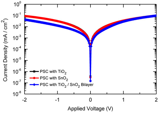 Figure 6. Dark current density-applied voltage curves of PSCs with TiO2, SnO2, and TiO2/SnO2 bilayer ETLs.