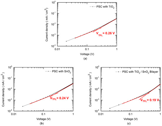 Figure 7. VTFL values of the PSC devices with (a) TiO2, (b) SnO2, and (c) TiO2/SnO2 bilayer ETLs.