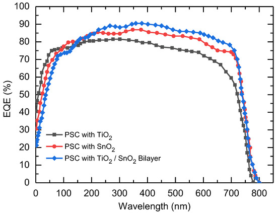 Figure 8. EQE curves of the PSC devices with TiO2, SnO2, and TiO2/SnO2 bilayer ETLs.