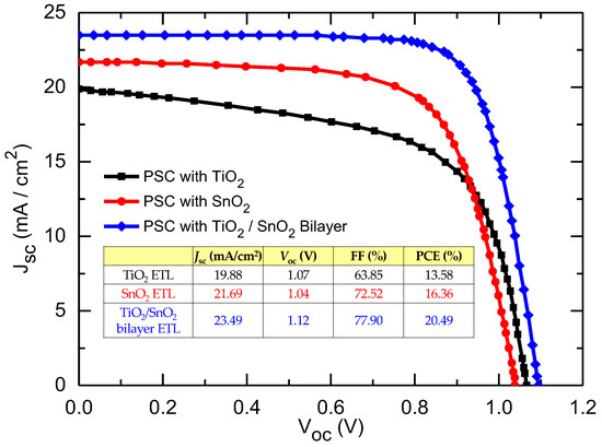 Figure 9 presents the J-V curves and indicates that PSCs with a TiO2/SnO2 bilayer result in a higher Jsc, Voc, and FF compared to traditional SnO2 or TiO2 single-layer ETLs, leading to superior PCEs for the solar cells.
