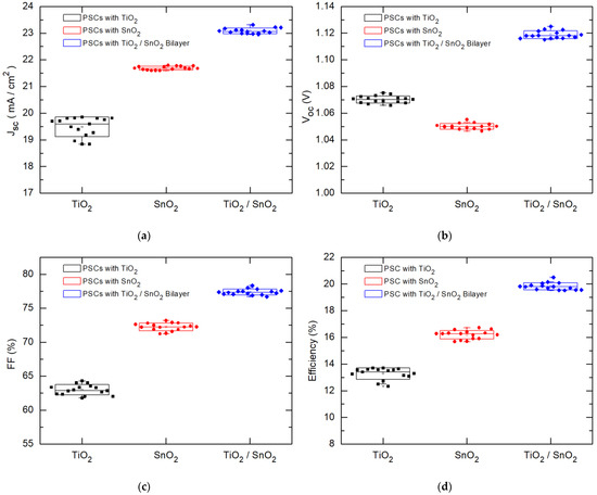 Figure 10. The statistical distribution of (a) Jsc, (b) Voc, (c) FF, and (d) efficiency of PSCs fabricated with TiO2, SnO2, and TiO2/SnO2 bilayer ETLs.
