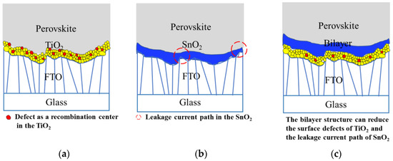 Figure 11. Schematic diagrams of (a) TiO2, (b) SnO2, and (c) TiO2/SnO2 bilayer ETL structures.