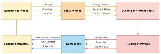 In the specific context of building energy performance prediction, the problem of classifying the large variety of modelling approaches available has been described in extensive literature reviews [38,39,40,41], considering both “top-down” and “bottom-up” perspectives, as indicated in Section 3. The necessity of employing both “forward” and “inverse” modelling approaches in an integrated way has been discussed both by Tian et al. [118] and Tronchin et al. [119], respectively, in relation to the problem of uncertainty in building performance simulation and the issue of energy efficiency, demand side management and storage in the built environment. In Figure 2, a simple example of “forward” and “inverse” modelling integration is presented. Inverse modelling can exploit typically purely data-driven methods or hybrid physical–statistical approaches and constitutes a point of contact with the problems illustrated in Section 3.2.