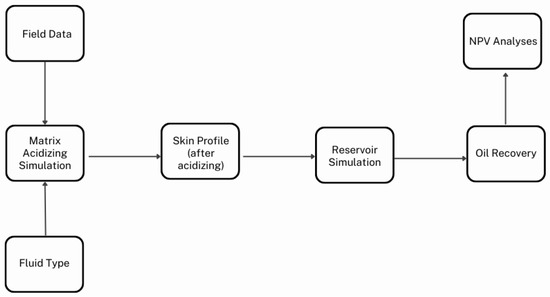 Figure 1 illustrates the workflow employed in this study, involving the modeling and simulation of two stages in the productive life of an oil field: (1) matrix stimulation operations during the wells’ completion and (2) reservoir management with a focus on analyzing the oil production curve over a 30-year period.