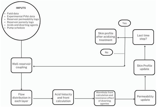 Figure 2 illustrates the flowchart for the acidizing simulation methodology. The simulation begins with the simulation of the well–reservoir coupling, where the flow distribution along the wellbore and in the reservoir is calculated. This step utilizes input data from PVbt experiments, the initial permeability and porosity logs, and the damage skin profile.