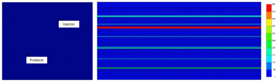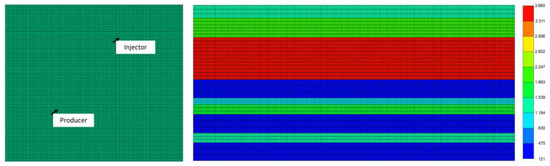 The reservoir simulations were conducted using the IMEX 2023.40 module from the Computer Modelling Group (CMG) company (Calgary, Alberta). The reservoir models, depicted in Figure 3, were constructed in a ¼ of 5-spot configuration, comprising a pair of wells, one for production and the other for injection, treated as “twin wells” within the subdomain. The grid contained 255 × 225 cells in the i and j directions, respectively, covering an area of 5,737,500 m2 and initially fully saturated with oil. There were 39 layers in the k direction, with varying layer sizes ranging from 1.03 m to 3.06 m and different porosity values (ranging from 0.1 to 0.19) and vertical permeability values (ranging from 121 to 3665 mD).