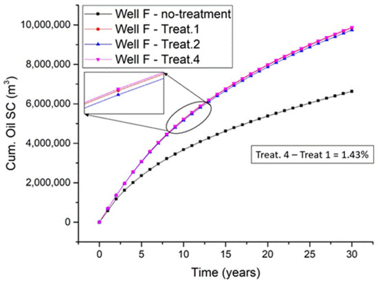 Accumulated oil production in the treatments for well F over a period of 30 years.