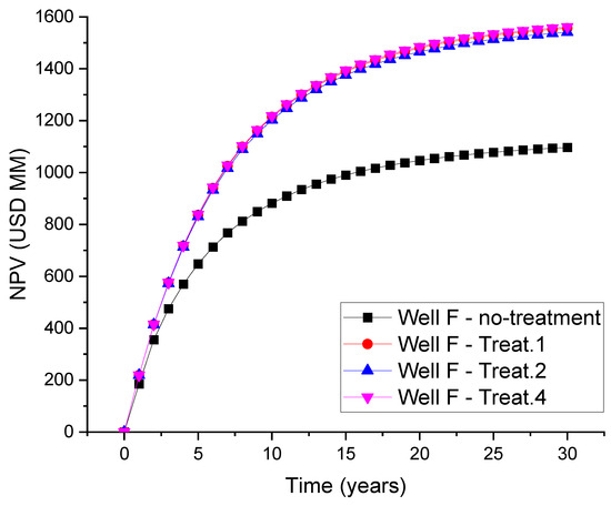 NPV curve (revenue only) for the cases studied in well F (interest rate = 9% year; USD 55/barrel).