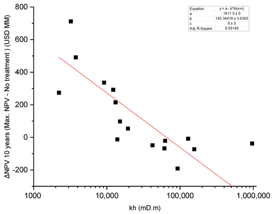 Figure 9 provides an overview of the compiled results for the impact for acidizing versus not acidizing the wells, illustrating the NPV differences between the cases with and without stimulation according to their respective flow capacities. The data points exhibit high dispersion due to variations in other reservoir characteristics, such as the net pay and heterogeneities between the studied intervals. The straight line depicted in the figure represents the discernible trend, but it is not intended to encompass all the data points. Notably, the results indicate a flow capacity range from approximately 20,000 to 40,000 md.m, beyond which acidizing the wells seems to offer little to no financial return, and in some cases, may even be detrimental to oil recovery. Consequently, it appears advisable to refrain from acidizing wells with flow capacities above this range.