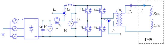 The PIHS power in the considered power supply system (Figure 1) can be measured as the active power supplied to the IHS, while measuring the power losses in the inductor is technically difficult to implement in real-world conditions for estimating the volumetric heat capacity of the sample material. It can be performed during system calibration (maintaining the operating frequency value) and transferred to the value of the equivalent resistance of the inductor, which, with a known current value, gives information about the Pind loss power in the inductor. However, such an approach is only possible when the material parameters of the charge, that is, resistivity and magnetic permeability, do not affect the value of the equivalent resistance of the inductor (that is, the Pind value at a given current intensity and frequency). For non-magnetic samples [11], this effect is negligible and can be neglected.