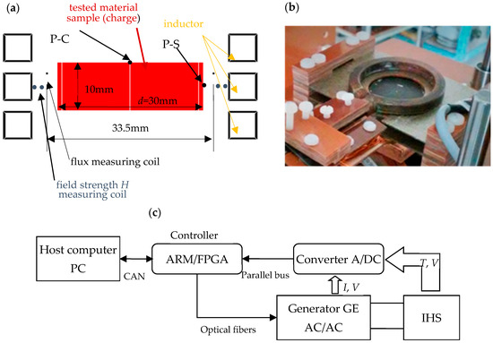 Correct information about the temperature characteristics of the above material properties is important both at the design stage and during the implementation of the induction heating process. The measurement and determination of these parameters, especially in the form of temperature characteristics, requires the use of various techniques and measuring devices as well as qualified personnel. Consequently, such measurements are expensive and time-consuming. On the other hand, growing technological requirements increasingly lead to the need for precise, reliable information about the properties of the processed material, which leads to the need to verify them in situ. The importance of the problem raised is confirmed by numerous publications [2,3,4,5,6,7,8,9,10,11], in which the issue of the possibly simplest and quickest way to determine material properties is considered, preferably several at once using one measurement station. The cited literature examples mainly concern attempts to determine thermal properties, that is, thermal diffusivity and volumetric heat capacity. Unfortunately, some of the presented techniques [2,3] either do not take into account the influence of temperature on thermal properties, cannot be used to test metals [3] or take into account temperature changes to a very small extent [4]. In the frequently used contact methods of providing thermal forcing, there are also significant problems with eliminating the influence of thermal resistances on connections [5]. In recent years, there has been promising information [6,7] about measurement techniques, allowing for the simultaneous determination of the temperature characteristics of specific heat and the specific thermal conductivity of metal samples with an accuracy of several percent. However, these techniques are based on the use of a resistive contact heat source, which makes them less useful in the case of higher temperatures encountered in metal processing thermal processes. The above-mentioned methods for simultaneous determination of more than one thermal material property are based on solving the problem of reverse heat conduction. A similar approach to determining the thermal material properties of metals, but using the induction heating method, is presented in the studies [8,9]. Also here, based on optimization techniques and measurement of temperature distribution in the tested sample, the possibility of indirectly determining the thermal properties of materials was indicated. The conclusions drawn from the above studies indicate that solving the inverse problem based on optimization techniques in order to simultaneously determine more than one material property is burdened with a significant risk of the so-called local minimum traps. This is an error resulting from the possibility of a similar effect of various properties sought on the measured temperature distribution. The risk of this error increases if we are dealing with a large range of temperature changes, which is typical for induction heating. In the case of induction heating, we also have to determine not only thermal but also electrical and magnetic properties, which further increases the risk of this error. In [10], an initial attempt was made to solve this problem by extending the scope of measurements performed. This extension involves performing measurement experiments on a test stand that will enable, with the highest possible accuracy, the estimation of the value of each of the sought material parameters separately. This allows for a very significant reduction in the range of variability of these parameters, the exact value of which can then be determined in the procedure of solving the inverse heat conduction problem (for example, in [8,9]), where a comprehensive multi-factor analysis is performed. A full development of this approach using the induction method as a source of excitation was presented for conductive, non-magnetic materials in [11]. Due to the significant influence of magnetic permeability on the effect of inducing eddy currents in the tested material, the method presented there cannot be directly transferred to ferromagnetic materials. The issue of isotropic ferromagnetic materials was taken up in this study.