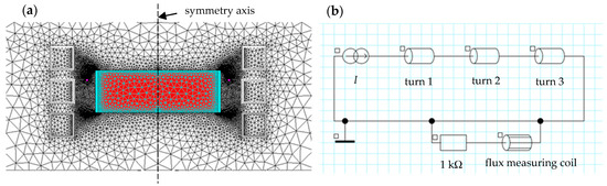 Simulation model of the measuring induction heating system: (a) geometry divided into finite elements and (b) electrical connection diagram.