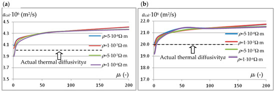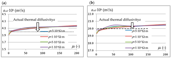 The influence of the value of magnetic permeability and resistivity of the tested sample material on the value of thermal diffusivity determined by the modified Flash method using the relationship (6): (a) for the actual value of diffusivity a = 4 × 10−6 m2/s and (b) for a = 20 × 10−6 m2/s.