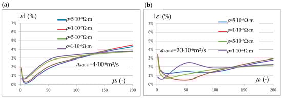 The influence of the value of magnetic permeability and resistivity of the tested sample material on the absolute value of the error in estimating thermal diffusivity using the relationship (7): (a) for the actual diffusivity value a = 4 × 10−6 m2/s and (b) for a = 20 × 10−6 m2/s.