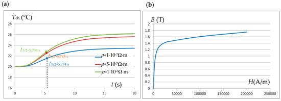 The study attempts to determine the scale of the error in estimating thermal diffusivity using Equation (7) in the case of magnetically nonlinear materials and attempts to limit this error. Assuming, as before, the time Δt = 10 ms of the duration of the impulse excitation of the inductor current with a frequency of f = 40 kHz and an intensity of I = ID = 1550 A, the temperature responses Tch(t) at point P_C of the sample were analysed for a material with nonlinear magnetization characteristics B(H). Figure 7a shows, for example, the responses Tch(t) at point P_C for a material with thermal diffusivity a = λ/χ = 20/(5 × 106) = 4 × 10−6 m2/s and with the magnetization characteristics B(H) shown in Figure 7b correspond to the characteristics of steel 1.3207 (SK10V), assuming three different resistivity values, that is, ρ = 1 × 10−7, ρ = 5 × 10−7 and ρ = 1 × 10−6 Ω⋅m.