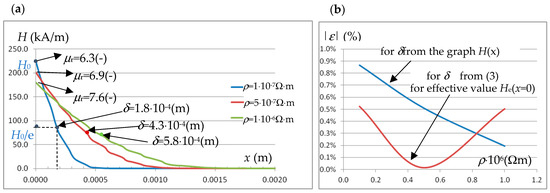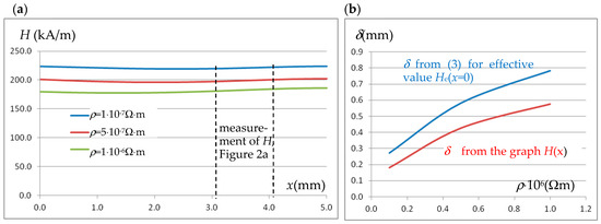 The distribution of the amplitude of the magnetic field intensity H in the near-surface layer at half the thickness of the cylindrical sample (from point P_S into the sample, Figure 2a) and the values of the penetration depth δ at different resistivities ρ of the sample material are given in Figure 8a.