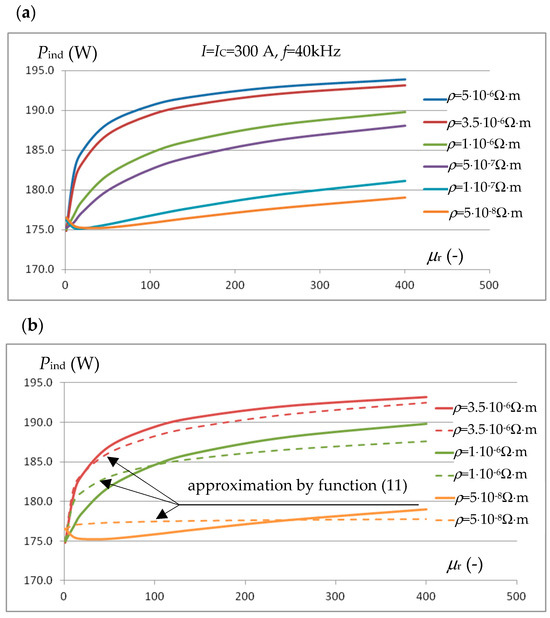 Assuming the magnetic linearity of the charge, the influence of the resistivity and relative magnetic permeability of the sample material on the losses in the inductor was analysed. Figure 10a shows the relationship Pind(μr,ρ) at the inductor current I = IC = 300 A and f = 40 kHz. The graphs in Figure 10a confirm that there is a slight influence of the resistivity ρ of the sample material on Pind when its magnetic permeability μr ≈ 1. With increasing permeability values, especially with higher resistivity values ρ, this influence increases significantly, although it is usually much smaller than 10%. It should be emphasized here that, unlike the impulse estimation of thermal diffusivity described above, carried out with short-term Δt but large ID values of the inductor current (which leads to strong magnetic saturation of the sample), volumetric heat capacity measurements are carried out with many times longer ΔAt but significantly weaker IC excitations inductor current so that the sample temperature increases by only a few degrees. For magnetic charges, this leads to weak magnetic saturation and much higher magnetic permeability values at the surface, and thus the possibility of a greater impact on the Pind value.