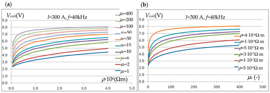For this reason, an additional single-turn coil was introduced in the system in Figure 2a to measure the magnetic flux. To ensure the greatest possible impact of the charge material on the Vcoil voltage induced in the coil, its diameter should be as close as possible to the diameter of the charge. Taking into account the thermal aspect (heating of the sample when estimating the temperature characteristics of material parameters), the coil diameter was set at Dcoil = 33.5 mm. For samples with different resistivities and magnetic permeabilities, the voltage response of the coil to the excitation current of the inductor I = 300 A and f = 40 kHz was calculated. To better illustrate the nature of the obtained waveforms, both the Vcoil(ρ) dependence (Figure 12a) for different values of μr and the Vcoil(μr) dependence (Figure 12b) for various ρ values are presented.