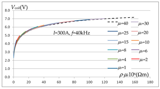 Taking into account the similar influence of ρ and μr on the Vcoil voltage, it was examined whether, in the considered system (as in the "long" system), it is also possible to talk about the unambiguity dependence of Vcoil(ρ⋅μr) on the product of these parameters. Figure 13 shows the family of characteristics Vcoil(ρ⋅μr) obtained from the characteristics presented in Figure 12, that is, determined while maintaining constant values of μr. The obtained waveforms indicate that with an error not exceeding 4%, one Vcoil(ρ⋅μr) characteristic can be used, which significantly facilitates the resistivity estimation procedure.