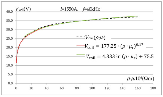 Figure 14, for I = 1550 A and frequency f = 40 kHz, presents a graphical approximation of the Vcoil(ρ⋅μr) relationship with functions (12).
