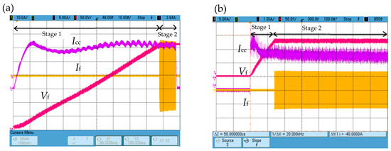 Oscillograms of the inverter voltage Vf, choke current Icc and inverter current If during the implementation of: (a) short-term Dirac pulse type and (b) long-term unit step.