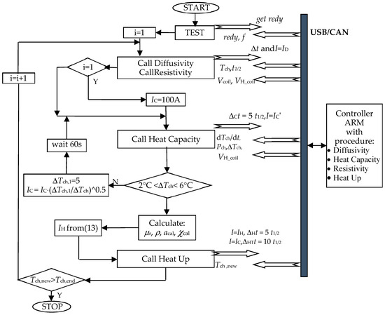 Both the thermal and electrical properties of materials are more or less dependent on temperature. For this reason, industrial practice usually requires knowledge about not only material properties at ambient temperature but also the temperature characteristics of these properties. At the discussed station, as shown in Figure 2, it is possible to comprehensively estimate the temperature characteristics of the conductive properties of the magnetic materials discussed above by sequentially implementing the diffusivity, resistivity and heat capacity procedures. This is a very important functionality of the discussed method. Using eddy current heating, it is possible to successively increase by step ΔstepTch the base temperature of the tested sample (Heat Up procedure) and to sequentially estimate the parameters at different temperatures of the tested material. For magnetic materials, knowledge of the previously determined magnetization characteristic B(H) is required. A simplified algorithm for the comprehensive estimation of the temperature characteristics of thermal diffusivity, resistivity and volumetric heat capacity for conductive magnetic materials is shown in Figure 16.