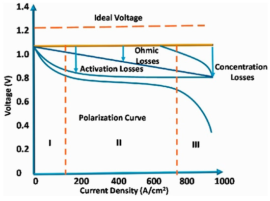 The characteristics of a fuel cell are typically represented by the polarization curve, which denotes the loss curve of the PEM fuel cell (Figure 2). As can be seen from the figure, the V/I change of the cell has a non-linear characteristic. Nonlinearity depends on factors such as current density, cell temperature, membrane humidity, and reactant partial pressure [18].