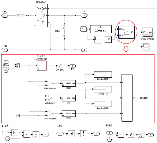 The DC voltage value obtained at the output of the PEMFC was applied to the input of the DC/DC converter. Figure 5 illustrates the simulink sub-model that was used for the DC/DC converter. As can be seen from the figure, two types of controllers such as PI and PIλ are employed for a DC/DC converter and the parameters of them are optimized with PSO and GA methods. In determining the optimum values, the process steps shown in Figure 6 are repeated for each fitness function such as IAE, ITAE, and ISTE.