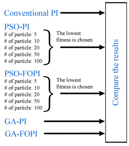 The procedures described in Figure 6 were employed to acquire the results using the ITAE fitness function. Figure 10 presents the outcomes attained by following the given procedures. As in the previous analysis, PSO-PI and PSO-FOPI applications were tested with 5, 10, 20, 50, and 100 particles in 100 iterations. Particles with the lowest fitness function were determined. In the PSO-PI study, the lowest fitness function value was obtained with 100 particles, while in the PSO-FOPI study, the lowest fitness function value was obtained with 20 particles. Subsequently, the optimum findings from PSO-PI and PSO-FOPI were compared with the optimum outcomes from the other methods (conventional PI, GA-PI, and GA-FOPI).