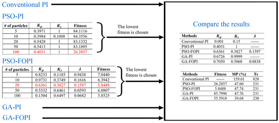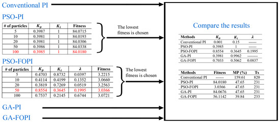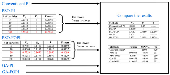 The optimum parameter values determined using the proposed methods (PSO-PI, PSO-FOPI, GA-PI, and GA-FOPI) for the controllers were determined using the fitness function IAE. As shown in Figure 7, determined optimum parameters were also listed with fitness function, maximum overshoot percent (MP%), and settling time (Ts) for each method. It can be observed that the suggested approaches outperform the conventional PI method when taking into account the MP% and Ts values. Specifically, it was noted that the GA-FOPI approach yielded the best performance, with MP% = 39.68.