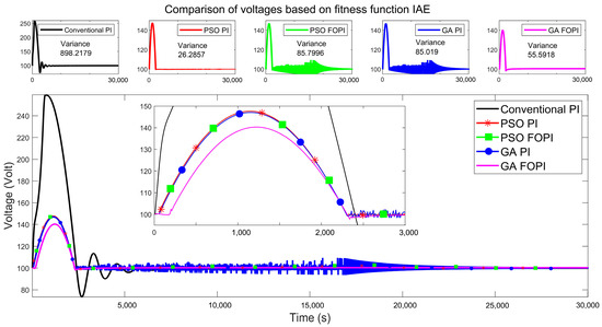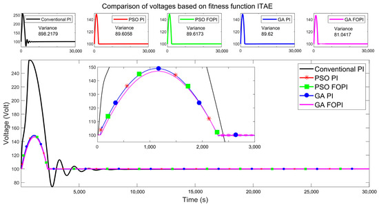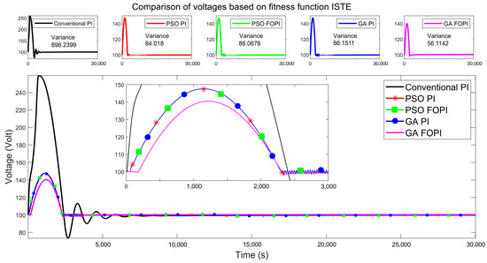 The voltage changes that were achieved at the system output with determined optimal parameters are shown in Figure 8. As seen from the figure, two points stand out in the voltage changes obtained using the methods. These are the MP% value and voltage oscillations at the initial stage. The overshoot value at system startup is directly proportional to the power consumption. According to this correlation, while a power consumption much higher than the nominal value is observed with the conventional PI approach at the initial stage, it is seen that the power consumption is lower with other proposed methods. The MP% values obtained at the end of the study are as follows: 159.61 V for conventional PI, 47.60 V for PSO-PI, 47.74 V for PSO-FOPI, 47.76 V for GA-PI, and 39.68 V for GA-FOPI. On the other hand, when we consider the change in output voltage, the largest oscillation was seen in the traditional PI approach (var 898.22, std 29.97). The observed values of the proposed methods are: (var 26.29, std 5.13) for PSO-PI, (var 85.80, std 9.26) for PSO-FOPI, (var 85.80, std 9.26) for GA-PI, and (var 55.59, std 7.46) for GA-FOPI. The presence of fluctuation might be read as the determined parameters not being at the optimal value but having reached a certain point. While the best performance according to MP% value was obtained with the GA-FOPI method, the best performance according to (var, std) values was obtained with the PSO-PI method.