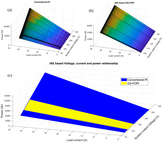 Figure 9 illustrates the voltage–current–power relationship, allowing for a clearer distinction between conventional PI and GA-FOPI. The changes in the conventional PI and GA-FOPI method are shown in Figure 9a,b, respectively. As seen in Figure 9a, since the voltage change at the system output obtained with conventional PI is in a wide band, the band range of the required power according to the change of current is wide. On the other hand, the proposed GA-FOPI method ensured that the voltage change at the system output was in a narrow band (Figure 9b). It is desirable for the voltage change to be in a narrow band range. This condition appears to be successfully achieved with GA-FOPI. In Figure 9c, for example, the voltage changes are displayed in different colors on the same graph to compare IAE-based approaches (conventional PI and GA-FOPI). It has been observed that, due to overshoot, the conventional PI works in a wide voltage band such as [73.52 259.40], while the GA-FOPI method operates in a narrow band such as [97.5 140.3].