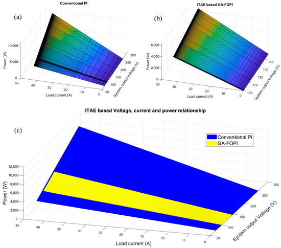 Voltage–current–power relationship based on ITAE (a) for conventional PI, (b) for GA-FOPI, (c) for both conventional PI and GA-FOPI.
