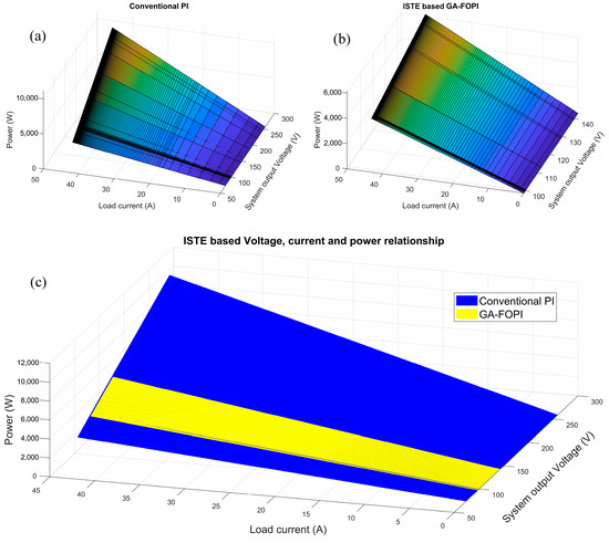 The voltage changes that were achieved at the system output with these optimal parameters is shown in Figure 14. The overshoot and oscillation parameters mentioned in the previous IAE and ITAE fitness functions are also taken into account in this section. In the early stage, the conventional PI methodology is seen to have a power consumption substantially higher than the nominal value; nevertheless, proposed approaches such as PSO-PI, PSO-FOPI, GA-PI, and GA-FOP show a lower power consumption. The overshoot values at system startup determined via ISTE are as follows: conventional PI 159.61V, PSO-PI 47.65V, PSO-FOPI 47.65V, GA-PI 47.65V, and GA-FOPI 39.84V. As in the previous applications, when we consider the change in output voltage, the observed values of the proposed methods are: (var 898.22, std 29.97) for traditional PI, (var 84.01, std 9.16) for PSO-PI, (var 84.06, std 9.16) for PSO-FOPI, (var 84.06, std 9.17) for GA-PI, and (var 56.11, std 7.49) for GA-FOPI. The best performance according to MP% and (var, std) criteria was obtained with the GA-FOPI method. However, if we consider the issue in the context of robustness, the best-performing GA-FOPI approach yielded a CV of 7.33, while the traditional PI method produced a CV of 27.99. According to these values, GA-FOPI once again produced the best results, but only marginally better than the others. As in the previous sections, the voltage–current–power relationship is shown in Figure 15 to better see the difference between conventional PI and GA-FOPI. The changes in the conventional PI and GA-FOPI method are shown in Figure 15a,b, respectively. In Figure 15c, the changes are shown together to see the difference more clearly. As can be seen from the Figure 15c, the voltage change in a narrower band range is obtained with the proposed GA-FOPI method compared to the conventional PI method. Due to overshoot, conventional PI operates in a wide voltage band [73.52 259.61], but GA-FOPI works in a tight band [97.42 140.46]. The voltage range that was seen in fitness functions IAE and ITAE was observed in ISTE as well.