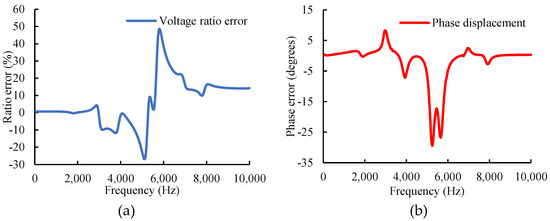 (a) Voltage ratio error response of a 50 kV IVT; (b) phase displacement error variation response of a 50 kV IVT.