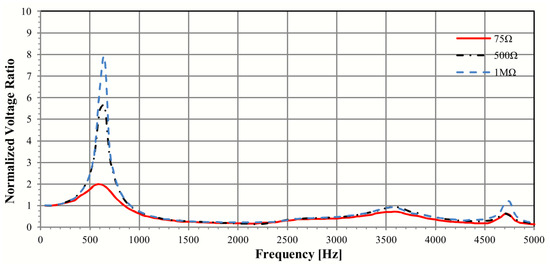 Normalized ratio frequency response of a 275 kV capacitive voltage transformer for different burden magnitudes [56].