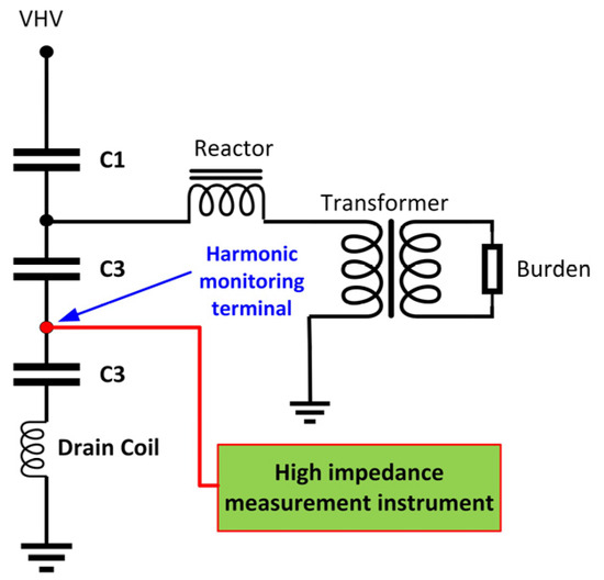 Schematic diagram of a modified CVT with a dedicated harmonic measurement terminal (own elaboration based on [62]).