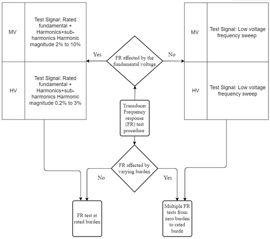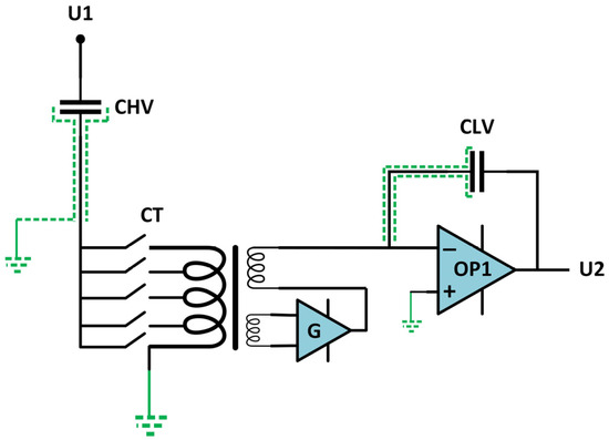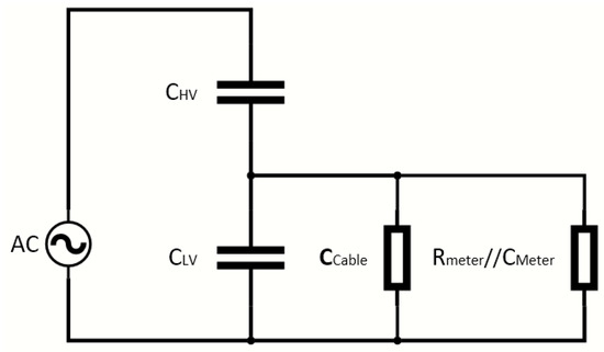 The transfer function of an ideal CVD is independent of frequency. However, the actual transfer function of the CVD may be influenced by the loading effect of the measuring cables and low-voltage measurement equipment [77,79] as illustrated in Figure 8.