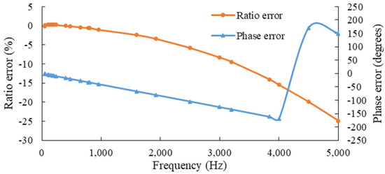 IVTs use the principle of electromagnetic induction to scale high voltages down to low voltages based on the turns ratio of the primary to secondary winding. IVTs are widely used for voltage measurement in MV/HV power systems where the accuracy is specified only at the fundamental frequency [48]. Figure 2a,b show the voltage ratio error and phase displacement response of a 50 kV IVT with oil and paper insulation for frequencies from 50 Hz to 10 kHz.