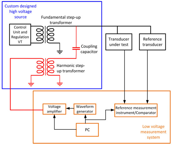 - Kaczmarek, M.; Stano, E. Measuring system for testing the transformation accuracy of harmonics of distorted voltage by medium voltage instrument transformers. Measurement 2021, 181, 109628. [Google Scholar] [CrossRef]