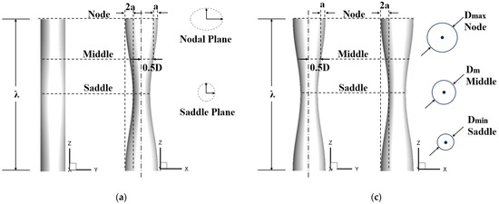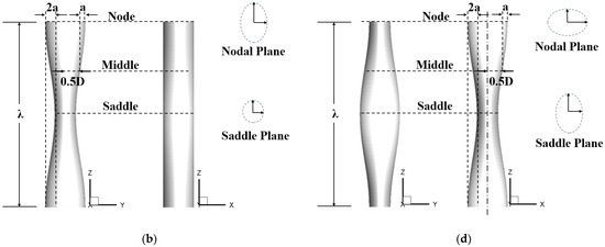 The locations of , and are at the node, the middle and the saddle, respectively, as shown in Figure 2. As mentioned above, the combination of λ/Dm = 2.273 and a/Dm = 0.091 is considered Case 1, while the combination of λ/Dm = 6.06 and a/Dm = 0.152 is considered Case 2.