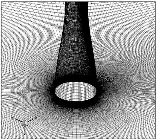 Figure 4 shows a typical grid system. The grid distribution is non-uniform in the x–y plane and uniform along the z direction. The distance between the cylinder surface and the nearest grid points is confined to 1, where is the friction velocity and is the wall shear stress. Grid stretching was used to increase the grid resolutions near the surface and in the wake region. There are 250 grids around the cylinder circumference, which corresponds to 61,752 cells in the x–y plane. The number of uniform grid layers along the z direction ranges from 65 to 121, depending on the wavelength of the sinusoidal cylinder.
