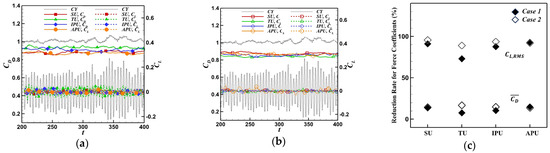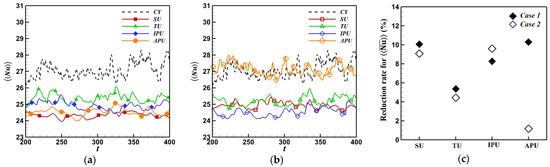 For in Case 2, the SU cylinder provides the smallest value among the different undulated cylinders, as described in Figure 5b. Thus, the SU cylinder shows the largest reduction rate of at 95.6%, as shown in Figure 5c. By contrast, the TU cylinder presents the largest value of , resulting in the smallest reduction rate of 89.1% for . The values of for the IPU and APU cylinders are in the middle of those of the SU and TU cylinders, as shown in Figure 5b. The APU cylinder’s is ranked as the second lowest value, leading to a 92% reduction rate of , as shown in Figure 5c.