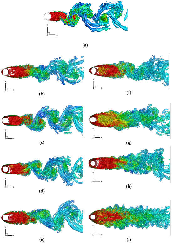 More specifically, for Case 1, the vortical structure of the TU cylinder in Figure 6c shows that vortex shedding occurs relatively early in the near-wake region, which is strongly associated with and is supported by the highest values of and as shown in Figure 5a, corresponding to the lowest values for the reduction rates of and shown in Figure 5c.